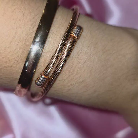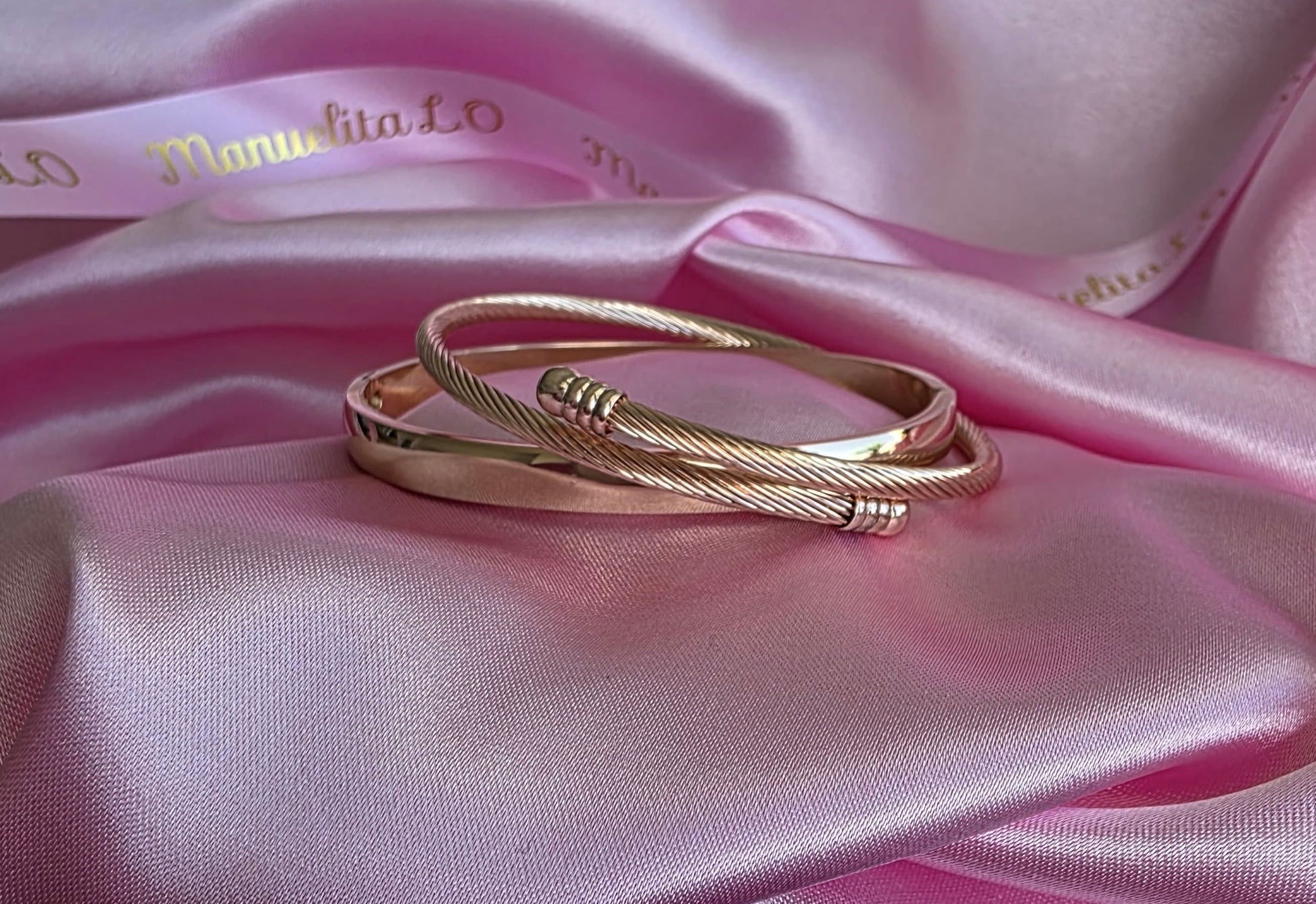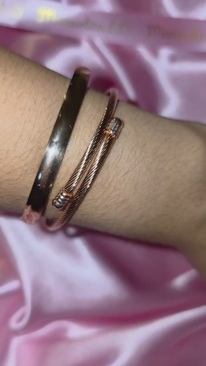 Ambas pulseras en un lujoso tono oro rosa, perfecto para llevar juntas como un stack moderno y romántico, o por separado para un toque de elegancia sutil.