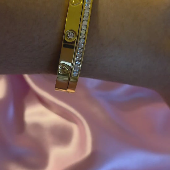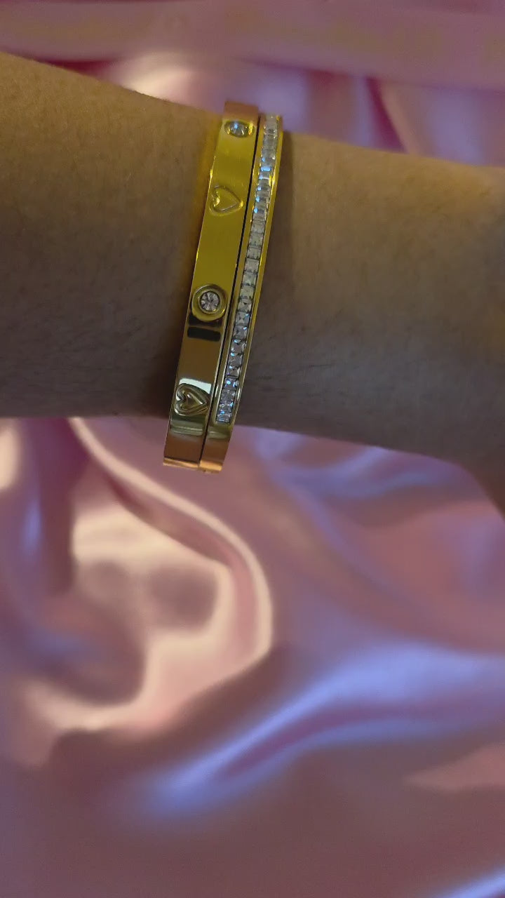 La Pulsera "Sello": Una pulsera rígida grabada con delicados corazones y "sellada" con brillantes cristales redondos, un símbolo de amor y afecto.